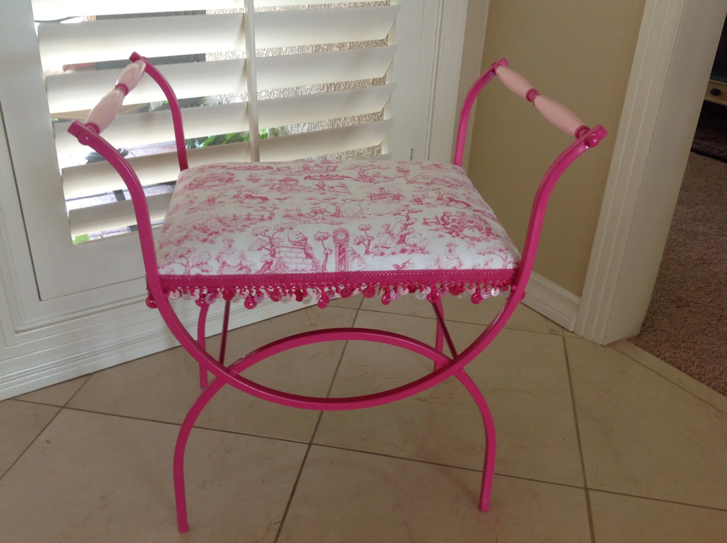 This vanity seat has a cute pink and white nursery rhyme themed fabric and a multi-colored button trim. The metal seat was sprayed in a pink berry color and the wooden seat handles were sprayed in a ballet pink for contrast.